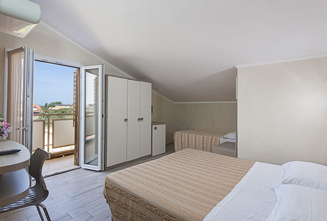 Le camere sono spaziose e funzionali, arredate modernamente per rendere le Vacanze della nostra clientela un'esperienza riposante come meritano. Gli ampi balconi completano l'arredamento di ogni camera.